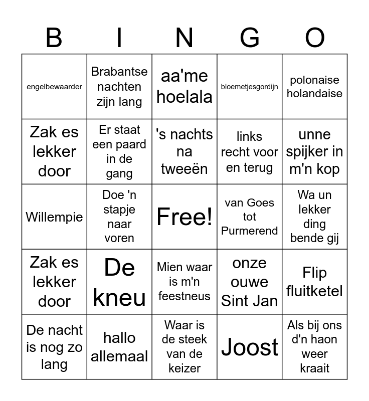This bingo card has a free space and 35 words: Liever te dik in de kist, Ons moeder zeej nog, Bloemkolen, Er staat een paard in de gang, Mien waar is m'n feestneus, bloemetjesgordijn, Zak es lekker door, Als het gras twee kontjes hoog is, 's nachts na tweeën, Pizzalied, Willempie, polonaise holandaise, Ik wil op m'n kop een kamerbreed tapijt, bij ons staat op de keukendeur, engelbewaarder, van Goes tot Purmerend, Joost, Doe 'n stapje naar voren, Zak es lekker door, Als bij ons d'n haon weer kraait, onze ouwe Sint Jan, De nacht is nog zo lang, Flip fluitketel, hallo allemaal, aa'me hoelala, unne spijker in m'n kop, ik wil met jou wel 7 weken, ik breng geen bloemen voor je mee, links recht voor en terug, Wa un lekker ding bende gij, Daar mag je alleen maar naar kijken, Waar is de steek van de keizer, De kneu, Brabantse nachten zijn lang and De barg he un krul in de staart.