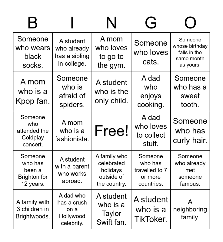 This bingo card has a free space and 24 words: A family with 3 children in Brightwoods., A student with a parent who works abroad., A student who is the only child., A student who is a TikToker., Someone whose birthday falls in the same month as yours., Someone who wears black socks., A student who already has a sibling in college., A mom who loves to go to the gym., A dad who loves to collect stuff., Someone who has curly hair., Someone who attended the Coldplay concert., Someone who is afraid of spiders., Someone who has travelled to 7 or more countries., Someone who already met someone famous., A mom who is a Kpop fan., A dad who has a crush on a Hollywood celebrity., A student who is a Taylor Swift fan., Someone who loves cats., Someone who has a sweet tooth., Someone who has been a Brighton for 12 years., A mom who is a fashionista., A family who celebrated holidays outside of the country., A dad who enjoys cooking. and A neighboring family..