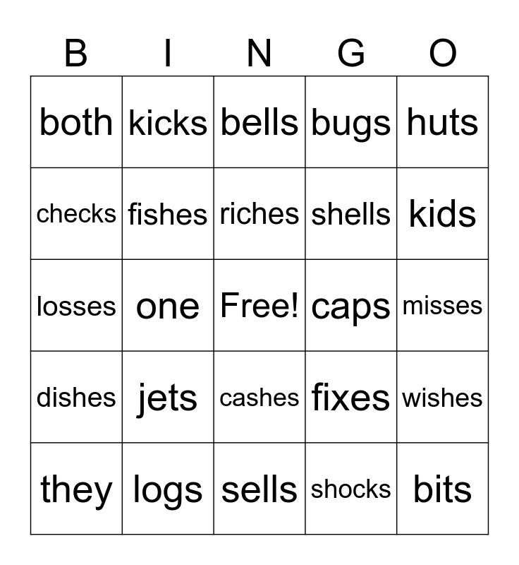 This bingo card has a free space and 29 words: they, have, one, from, both, bells, fishes, jets, caps, logs, misses, bits, sells, shocks, kids, fills, cashes, dishes, huts, losses, fixes, gaps, shells, checks, bugs, kicks, wishes, riches and pigs.