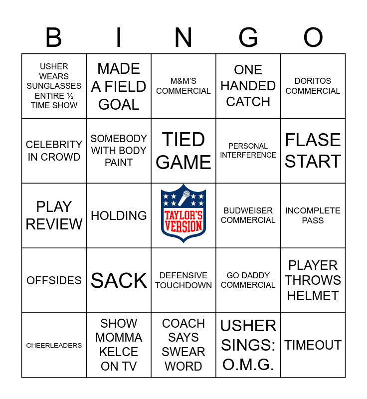 This bingo card has a free space and 51 words: SHOW TAYLOR ON TV, TIMEOUT, USHER SINGS: YEAH, COACH SAYS SWEAR WORD, SACK, CHIEFS SWAG SURFIN, MADE A FIELD GOAL, SPONGEBOB BUBBLE BOWL PERFORMANCE, CELEBRITY IN CROWD, CELEBRITY ENDORSED COMMERCIAL, SOMEBODY WITH BODY PAINT, ONE HANDED CATCH, PLAYER THROWS HELMET, GO DADDY COMMERCIAL, TAYLOR HAS A DRINK IN HER HAND, INTERCEPTION, TIED GAME, BUDWEISER COMMERCIAL, PLAYER IS CRYING, DORITOS COMMERCIAL, HOLDING, USHER SINGS: O.M.G., USHER WEARS SUNGLASSES ENTIRE ½ TIME SHOW, PERSONAL INTERFERENCE, USHER SINGS: YOU REMIND ME, TOUCHDOWN DANCE, FLASE START, MISSED FIELD GOAL, CHEERLEADERS, M&M’S COMMERCIAL, CHIEFS IN THE LEAD BEFORE HALFTIME, PEPSI COMMERCIAL, INTOXICATED FAN, INJURY, DELAY OF GAME, SHOW MOMMA KELCE ON TV, BRAND USES A HASHTAG, QUARTER BACK TAKES A KNEE, JUSTIN BIEBER GUEST PERFORMANCE, FAN WITHOUT A SHIRT ON, INCOMPLETE PASS, OFFSIDES, KICK RETURN TOUCHDOWN, MOVIE TRAILER, FLAG, 49ERS IN THE LEAD BEFORE HALFTIME, PLAY REVIEW, WILL.I.AM GUEST PERFORMANCE, FUMBLE, DEFENSIVE TOUCHDOWN and 2 POINT CONVERSION.