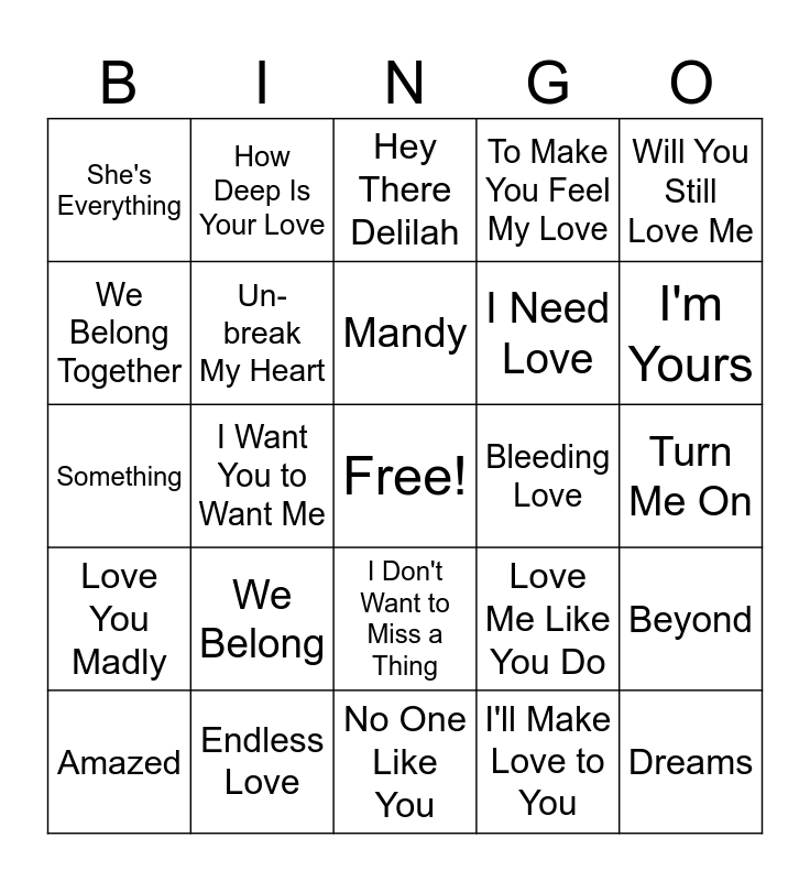 This bingo card has a free space and 56 words: Every Breath You Take, Amazed, I Will Always Love You, She's Everything, No One Like You, Love Story (Taylor's Version), Un-break My Heart, My Boo, I Need Love, You're Beautiful, To Make You Feel My Love, To All The Girls I've Loved Before, When a Man Loves a Women, You Make Loving Fun, I Want It That Way, Love Somebody, Will You Still Love Me, I Want You to Want Me, Hopelessly Devoted to You, Dreams, Bleeding Love, It's Your Love, Love Me Like You Do, Hey There Delilah, Dilemma, Mandy, Kiss Me, The Power of Love, I'm Yours, Kiss from a Rose, Take My Breath Away, Unchained Melody, 2 Becomes 1, Crazy Little Thing Called Love, Turn Me On, We Belong Together, Something, Perfect, Love You Madly, How Deep Is Your Love, I Don't Want to Miss a Thing, I Want to Know What Love Is, Tennesee Whiskey, Sugar, We're Goin Down, Always on Time, We Belong, Endless Love, You're Still The One, All Out of Love, More Than Words, I'll Make Love to You, When You Say Nothing At All, I Cross My Heart, Stay With Me, Beyond and My Girl.