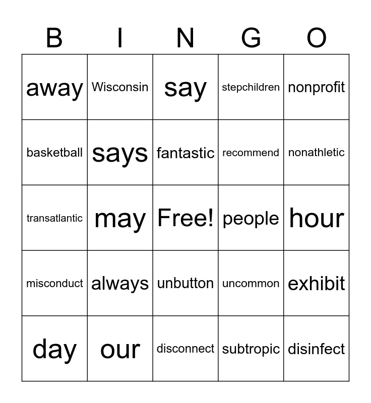 This bingo card has a free space and 29 words: day, today, may, way, away, say, says, always, people, our, hour, disinfect, disconnect, subtropic, nonathletic, inhabit, unbutton, misconduct, nonprofit, transatlantic, uncommon, establish, recommend, basketball, stepchildren, Wisconsin, exhibit, fantastic and accomplish.