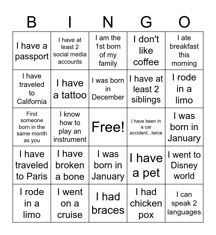 This bingo card has a free space and 24 words: I have broken a bone, I went on a cruise, I was born in December, I rode in a limo, I ate breakfast this morning, I have a passport, I have traveled to California, I have at least 2 social media accounts, I have been in a car accident...twice, I was born in January, I have at least 2 siblings, Find someone born in the same month as you, I have a pet, I went to Disney world, I have a tattoo, I had chicken pox, I was born in January, I am the 1st born of my family, I rode in a limo, I know how to play an instrument, I can speak 2 languages, I have traveled to Paris, I don't like coffee and I had braces.