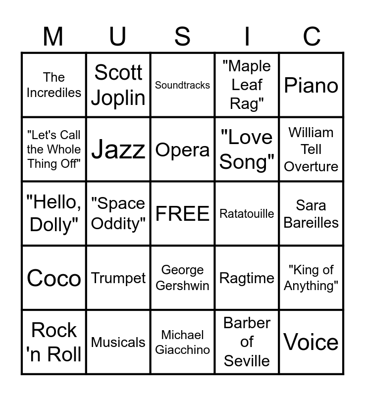 This bingo card has a free space and 34 words: Rhapsody in Blue, Barber of Seville, Inside Out, "Changes", Coco, Jazz, Piano, Rock 'n Roll, Scott Joplin, "Brave", Opera, Soundtracks, Zootopia, Pop, Ratatouille, William Tell Overture, Musicals, "Hello, Dolly", Trumpet, Ragtime, George Gershwin, Up, The Incrediles, Sara Bareilles, Michael Giacchino, Voice, "Maple Leaf Rag", Gioachino Rossini, "Love Song", "Let's Call the Whole Thing Off", Louis Armstrong, "Space Oddity", "King of Anything" and David Bowie.