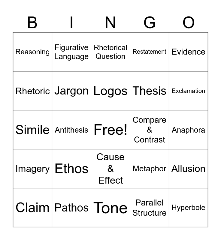 This bingo card has a free space and 24 words: Ethos, Pathos, Logos, Claim, Evidence, Reasoning, Rhetoric, Figurative Language, Compare & Contrast, Cause & Effect, Thesis, Simile, Metaphor, Allusion, Jargon, Parallel Structure, Anaphora, Rhetorical Question, Exclamation, Antithesis, Hyperbole, Imagery, Restatement and Tone.