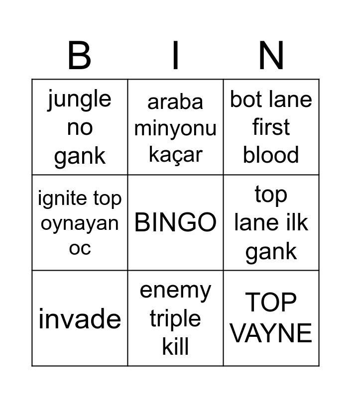 This bingo card has a free space and 8 words: top lane ilk gank, bot lane first blood, araba minyonu kaçar, invade, jungle no gank, TOP VAYNE, ignite top oynayan oc and enemy triple kill.