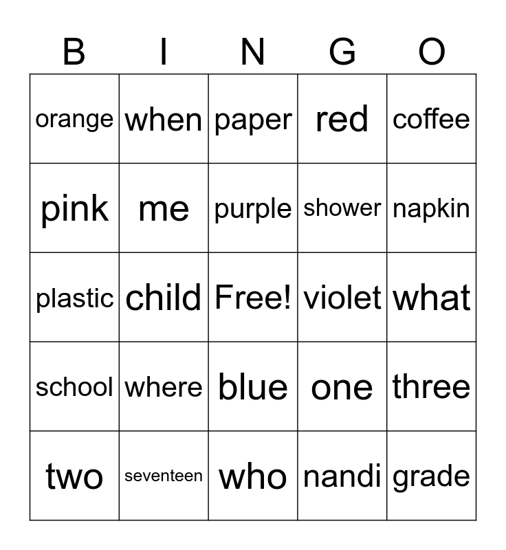 This bingo card has a free space and 35 words: hi, bye, you, me, blue, red, pink, yellow, purple, cup, plastic, coffee, water, phone, orange, violet, nandi, child, school, grade, one, two, three, seventeen, paper, napkin, towel, bath, shower, what, why, who, where, when and i.