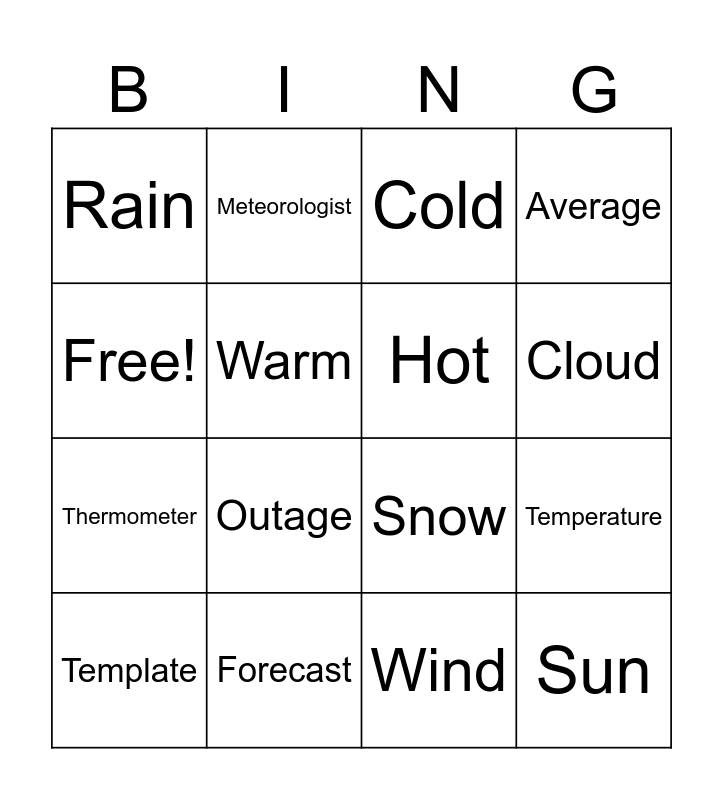This bingo card has 16 words: Forecast, Temperature, Cold, Rain, Thermometer, Meteorologist, Snow, Wind, Free!, Warm, Template, Average, Outage, Cloud, Hot and Sun.