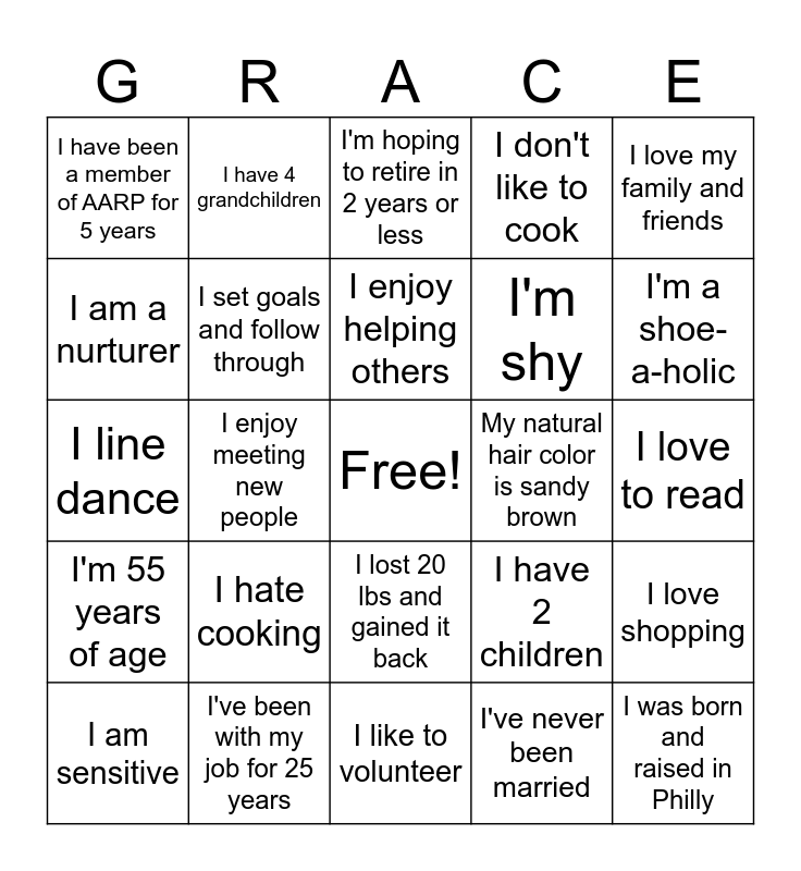This bingo card has a free space and 24 words: I hate cooking, I've been with my job for 25 years, I enjoy helping others, I am sensitive, I love my family and friends, I have been a member of AARP for 5 years, I am a nurturer, I have 4 grandchildren, My natural hair color is sandy brown, I lost 20 lbs and gained it back, I'm shy, I line dance, I have 2 children, I love shopping, I set goals and follow through, I've never been married, I love to read, I'm hoping to retire in 2 years or less, I'm a shoe-a-holic, I enjoy meeting new people, I was born and raised in Philly, I'm 55 years of age, I don't like to cook and I like to volunteer.