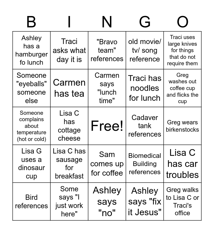 This bingo card has a free space and 24 words: Lisa C has sausage for breakfast, Some says "I just work here", Carmen says "lunch time", Bird references, Traci uses large knives for things that do not require them, Ashley has a hamburger fo lunch, Someone "eyeballs" someone else, Traci asks what day it is, Cadaver tank references, Sam comes up for coffee, Traci has noodles for lunch, Someone complains about temperature (hot or cold), Biomedical Building references, Lisa C has car troubles, Carmen has tea, Ashley says "fix it Jesus", Greg wears birkenstocks, "Bravo team" references, Greg washes out coffee cup and flicks the cup, Lisa C has cottage cheese, Greg walks to Lisa C or Traci's office, Lisa G uses a dinosaur cup, old movie/ tv/ song reference and Ashley says "no".