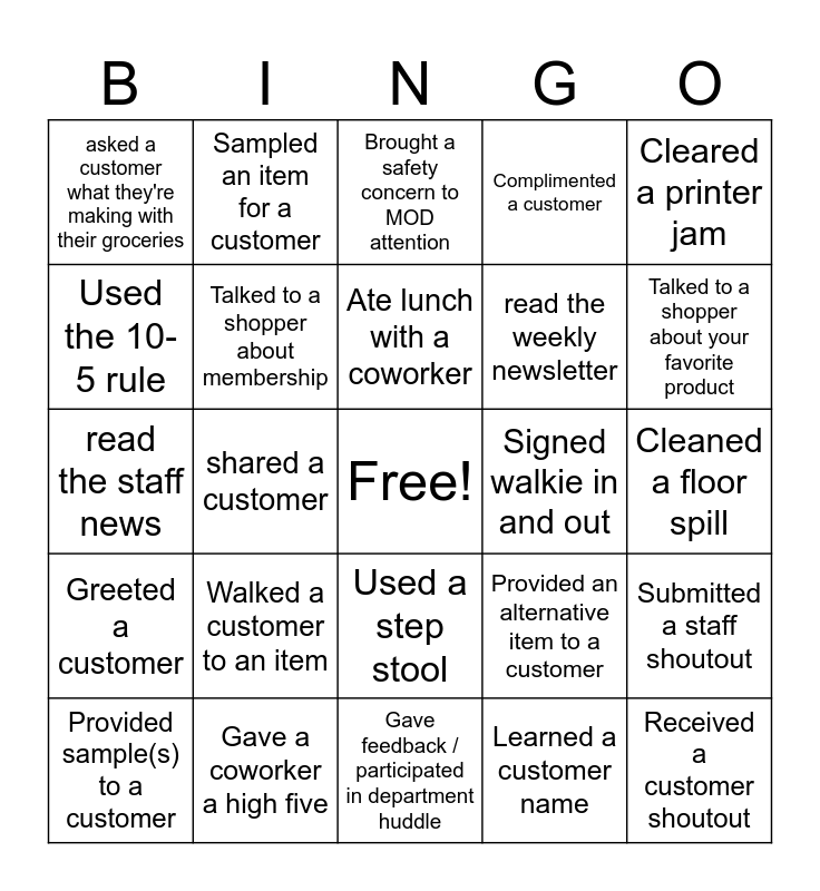 This bingo card has a free space and 24 words: Walked a customer to an item, Gave a coworker a high five, Ate lunch with a coworker, Provided sample(s) to a customer, Cleared a printer jam, asked a customer what they're making with their groceries, Used the 10-5 rule, Sampled an item for a customer, Signed walkie in and out, Used a step stool, read the weekly newsletter, read the staff news, Provided an alternative item to a customer, Submitted a staff shoutout, Talked to a shopper about membership, Learned a customer name, Cleaned a floor spill, Brought a safety concern to MOD attention, Talked to a shopper about your favorite product, shared a customer, Received a customer shoutout, Greeted a customer, Complimented a customer and Gave feedback / participated in department huddle.