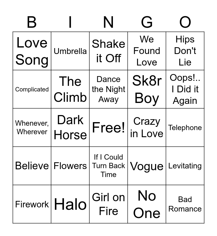 This bingo card has a free space and 29 words: Firework, Hello, Dark Horse, Rolling in the Deep, Love Song, Shake it Off, The Climb, Flowers, Crazy in Love, Halo, Telephone, Bad Romance, Girl on Fire, No One, Oops!.. I Did it Again, Toxic, If I Could Turn Back Time, Believe, Hips Don't Lie, Whenever, Wherever, Vogue, Material Girl, Sk8r Boy, Complicated, We Found Love, Umbrella, Levitating, Dance the Night Away and Ocean Eyes.