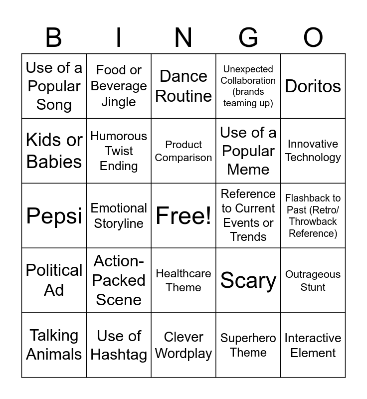 This bingo card has a free space and 29 words: Talking Animals, Celebrity Cameo, Emotional Storyline, Product Mascot, Use of a Popular Song, Dance Routine, Humorous Twist Ending, Action-Packed Scene, Reference to Current Events or Trends, Use of Hashtag, Flashback to Past (Retro/ Throwback Reference), Interactive Element, Clever Wordplay, Superhero Theme, Innovative Technology, Social Cause Related to Diversity and Inclusion, Healthcare Theme, Political Ad, Doritos, Pepsi, Scary, Movie Trailer, Use of a Popular Meme, Kids or Babies, Unexpected Collaboration (brands teaming up), Food or Beverage Jingle, Outrageous Stunt, Product Comparison and Car Commercial with Scenic Shots.