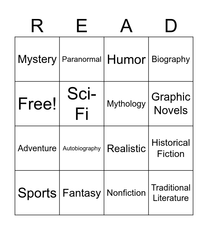 This bingo card has 16 words: Fantasy, Historical Fiction, Humor, Mystery, Adventure, Paranormal, Realistic, Nonfiction, Free!, Sci-Fi, Sports, Biography, Autobiography, Graphic Novels, Mythology and Traditional Literature.