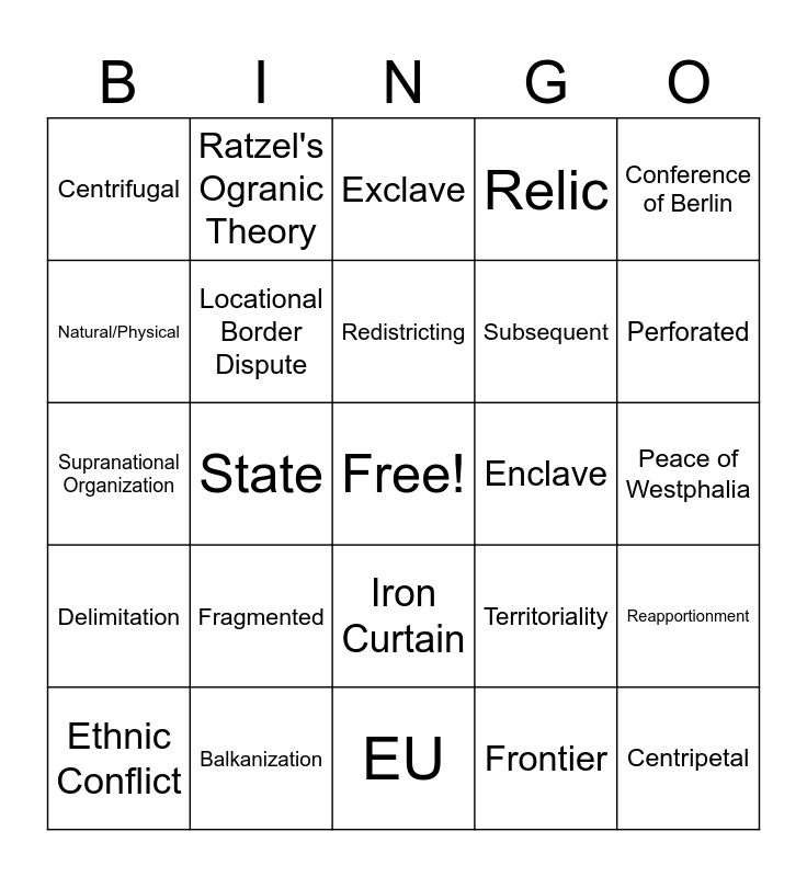 This bingo card has a free space and 62 words: Annexation, Balkanization, Demarcation, Delimitation, Operational Border Dispute, Allocational Border Dispute, Locational Border Dispute, Antecedent, Subsequent, Superimposed, Relic, Geometric, Natural/Physical, Ethnographic, Buffer State, Centrifugal, Centripetal, Conference of Berlin, Devolution, Redistricting, Enclave, Exclave, Ethnic Conflict, Frontier, Gerrymandering, Heartland Theory, Rimland Theory, Landlocked, Reapportionment, Mercantilism, Multinational States, Multistate Nation, Nation, Nation-State, Peace of Westphalia, Ratzel's Ogranic Theory, Self-Determination / Sovereignty, Shatterbelt, State, Stateless Nation, Supranational Organization, Compact, Fragmented, Prorupt, Perforated, Territoriality, Unitary State, Federation, Asymmetric Federalism, Challenge to The Modern State, Iron Curtain, EU, BREXIT, Forward Capital, Irredentism, Microstates, NAFTA, Separatism, Terrorism, Theocracies, Census and United Nations.