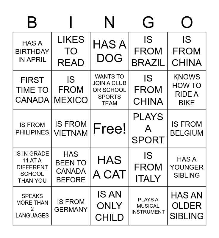 This bingo card has a free space and 24 words: HAS BEEN TO CANADA BEFORE, IS FROM GERMANY, WANTS TO JOIN A CLUB OR SCHOOL SPORTS TEAM, SPEAKS MORE THAN 2 LANGUAGES, IS FROM CHINA, HAS A BIRTHDAY IN APRIL, FIRST TIME TO CANADA, LIKES TO READ, PLAYS A SPORT, HAS A CAT, IS FROM CHINA, IS FROM PHILIPINES, IS FROM ITALY, HAS A YOUNGER SIBLING, IS FROM MEXICO, PLAYS A MUSICAL INSTRUMENT, IS FROM BELGIUM, HAS A DOG, KNOWS HOW TO RIDE A BIKE, IS FROM VIETNAM, HAS AN OLDER SIBLING, IS IN GRADE 11 AT A DIFFERENT SCHOOL THAN YOU, IS FROM BRAZIL and IS AN ONLY CHILD.