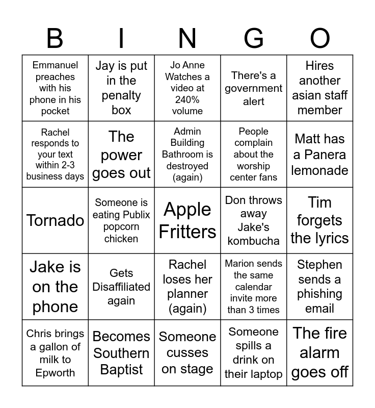 This bingo card has a free space and 24 words: Gets Disaffiliated again, Becomes Southern Baptist, Admin Building Bathroom is destroyed (again), Chris brings a gallon of milk to Epworth, Hires another asian staff member, Emmanuel preaches with his phone in his pocket, Rachel responds to your text within 2-3 business days, Jay is put in the penalty box, Don throws away Jake's kombucha, Rachel loses her planner (again), People complain about the worship center fans, Tornado, Marion sends the same calendar invite more than 3 times, Stephen sends a phishing email, The power goes out, Someone spills a drink on their laptop, Tim forgets the lyrics, Jo Anne Watches a video at 240% volume, Matt has a Panera lemonade, Someone is eating Publix popcorn chicken, The fire alarm goes off, Jake is on the phone, There's a government alert and Someone cusses on stage.