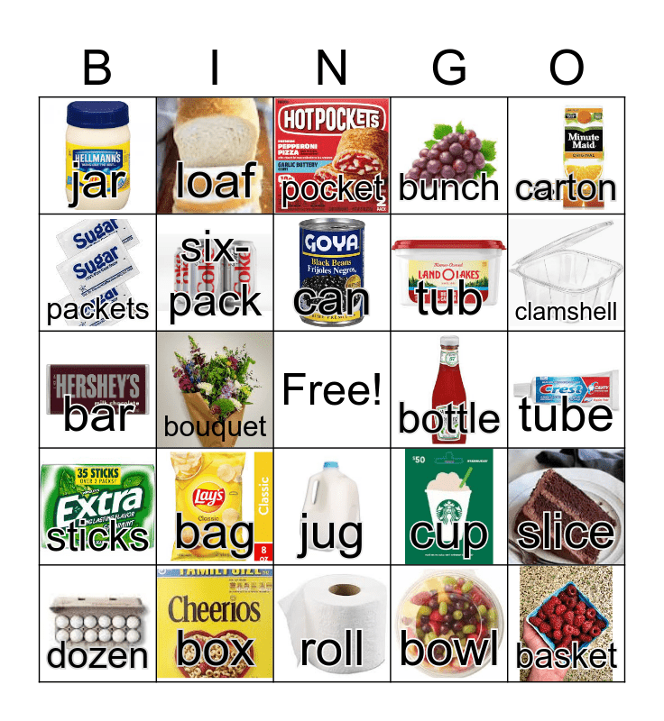 This bingo card has 24 images, a free space and 24 words: bag, box, can, dozen, carton, jar, packets, loaf, bottle, jug, tub, bar, cup, slice, six-pack, bowl, tube, pocket, clamshell, bouquet, basket, sticks, bunch and roll.
