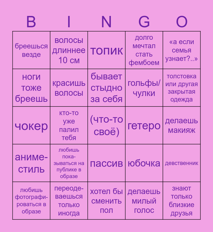 This bingo card has a free space and 24 words: любишь пока- зываться на публике в образе, переоде-ваешься только иногда, бывает стыдно за себя, любишь фотографи-роваться в образе, «а если семья узнает?..», бреешься везде, ноги тоже бреешь, волосы длиннее 10 см, гетеро, пассив, гольфы/чулки, чокер, юбочка, девственник, красишь волосы, делаешь милый голос, делаешь макияж, топик, толстовка или другая закрытая одежда, кто-то уже палил тебя, знают только близкие друзья, аниме-стиль, долго мечтал стать фембоем and хотел бы сменить пол.