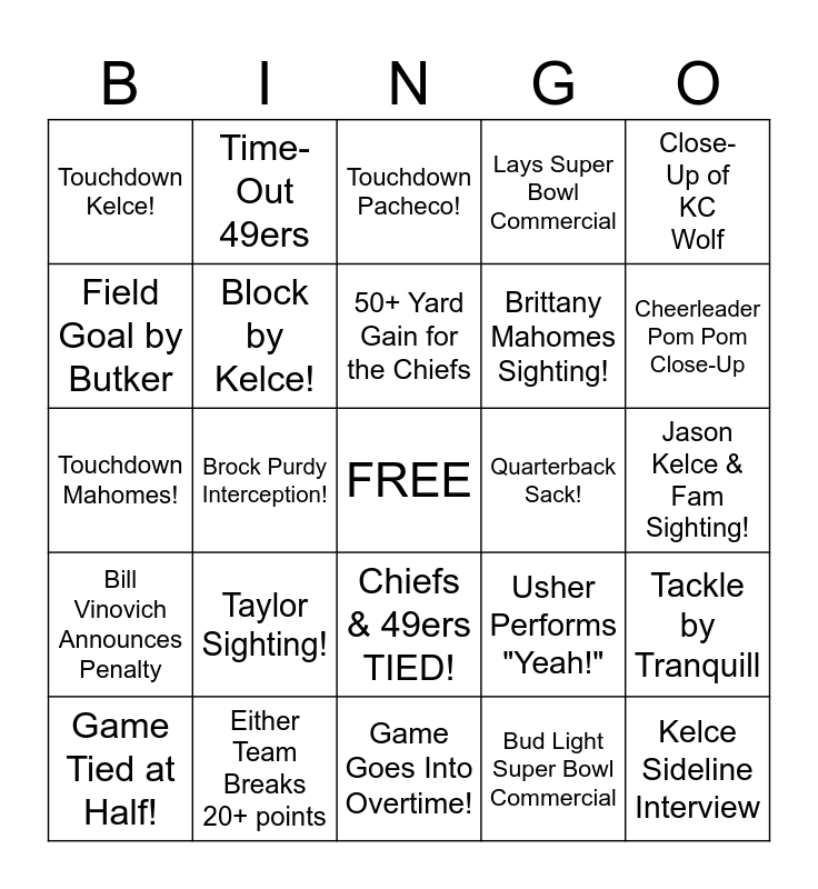 This bingo card has a free space and 24 words: Taylor Sighting!, Either Team Breaks 20+ points, 50+ Yard Gain for the Chiefs, Game Tied at Half!, Close-Up of KC Wolf, Touchdown Kelce!, Field Goal by Butker, Time-Out 49ers, Quarterback Sack!, Chiefs & 49ers TIED!, Brittany Mahomes Sighting!, Touchdown Mahomes!, Usher Performs "Yeah!", Tackle by Tranquill, Block by Kelce!, Bud Light Super Bowl Commercial, Jason Kelce & Fam Sighting!, Touchdown Pacheco!, Cheerleader Pom Pom Close-Up, Brock Purdy Interception!, Kelce Sideline Interview, Bill Vinovich Announces Penalty, Lays Super Bowl Commercial and Game Goes Into Overtime!.