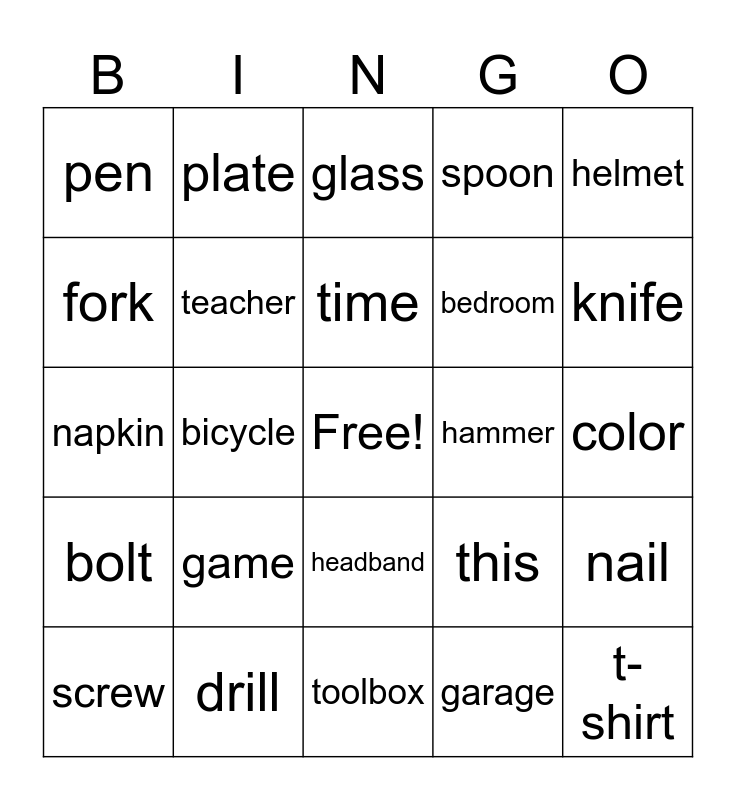 This bingo card has a free space and 27 words: this, that, bedroom, toolbox, fork, glass, plate, bolt, hammer, nail, napkin, spoon, screw, drill, knife, salt, teacher, time, game, pen, color, garage, bicycle, t-shirt, headband, helmet and sneakers.