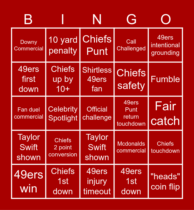 This bingo card has a free space and 24 words: Chiefs 2 point conversion, Chiefs 1st down, Shirtless 49ers fan, 49ers win, 49ers intentional grounding, Downy Commercial, 49ers first down, 10 yard penalty, 49ers Punt return touchdown, Taylor Swift shown, Chiefs safety, Fan duel commercial, Mcdonalds commercial, Chiefs touchdown, Chiefs up by 10+, 49ers 1st down, Fair catch, Chiefs Punt, Fumble, Celebrity Spotlight, "heads" coin flip, Taylor Swift shown, Call Challenged and 49ers injury timeout.
