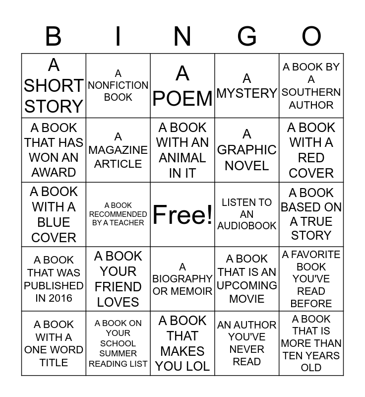 This bingo card has a free space and 24 words: A BOOK YOUR FRIEND LOVES, A BOOK ON YOUR SCHOOL SUMMER READING LIST, A BOOK WITH AN ANIMAL IN IT, A BOOK WITH A ONE WORD TITLE, A BOOK BY A SOUTHERN AUTHOR, A SHORT STORY, A BOOK THAT HAS WON AN AWARD, A NONFICTION BOOK, LISTEN TO AN AUDIOBOOK, A BIOGRAPHY OR MEMOIR, A GRAPHIC NOVEL, A BOOK WITH A BLUE COVER, A BOOK THAT IS AN UPCOMING MOVIE, A FAVORITE BOOK YOU'VE READ BEFORE, A MAGAZINE ARTICLE, AN AUTHOR YOU'VE NEVER READ, A BOOK BASED ON A TRUE STORY, A POEM, A BOOK WITH A RED COVER, A BOOK RECOMMENDED BY A TEACHER, A BOOK THAT IS MORE THAN TEN YEARS OLD, A BOOK THAT WAS PUBLISHED IN 2016, A MYSTERY and A BOOK THAT MAKES YOU LOL.