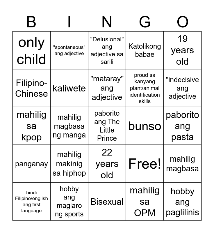 This bingo card has 27 words: Free!, hobby ang paglilinis, proud sa kanyang plant/animal identification skills, Bisexual, Filipino-Chinese, "Delusional" ang adjective sa sarili, "spontaneous" ang adjective, panganay, bunso, mahilig magbasa, mahilig sa kpop, Katolikong babae, hindi Filipino/english ang first language, hobby ang maglaro ng sports, "indecisive ang adjective, "vivacious" ang adjective sa sarili, kaliwete, "mataray" ang adjective, mahilig makinig sa hiphop, only child, paborito ang pasta, mahilig sa OPM, mahilig magbasa ng manga, paborito ang The Little Prince, 22 years old, 19 years old and perfectionist.