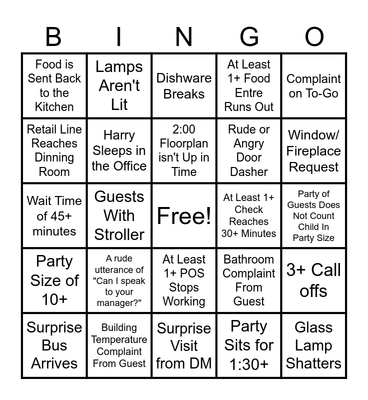 This bingo card has a free space and 24 words: Surprise Bus Arrives, A rude utterance of "Can I speak to your manager?", 2:00 Floorplan isn't Up in Time, Party Sits for 1:30+, Complaint on To-Go, Food is Sent Back to the Kitchen, Lamps Aren't Lit, Dishware Breaks, At Least 1+ Check Reaches 30+ Minutes, Party of Guests Does Not Count Child In Party Size, Wait Time of 45+ minutes, Harry Sleeps in the Office, Bathroom Complaint From Guest, 3+ Call offs, Retail Line Reaches Dinning Room, Building Temperature Complaint From Guest, Surprise Visit from DM, At Least 1+ Food Entre Runs Out, Window/ Fireplace Request, Party Size of 10+, Guests With Stroller, At Least 1+ POS Stops Working, Rude or Angry Door Dasher and Glass Lamp Shatters.