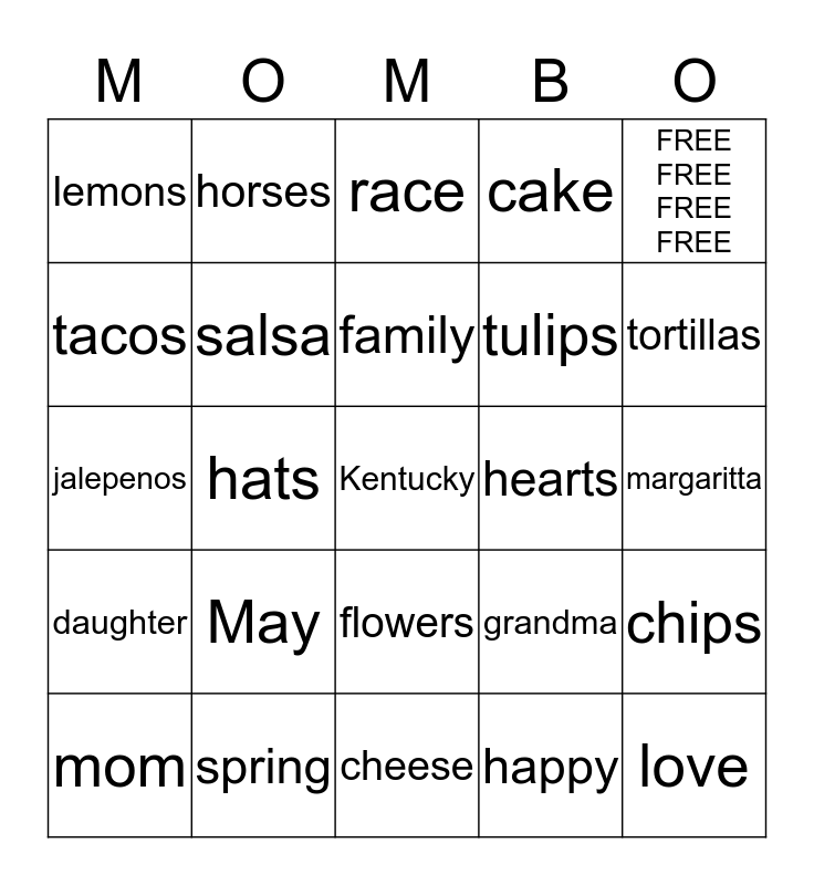 This bingo card has a free space and 24 words: May, spring, family, mom, FREE FREE FREE FREE, lemons, tacos, horses, hearts, flowers, tulips, jalepenos, grandma, chips, salsa, happy, margaritta, race, tortillas, hats, love, daughter, cake and cheese.