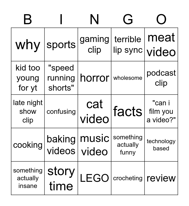 This bingo card has a free space and 24 words: baking videos, story time, horror, something actually insane, meat video, why, kid too young for yt, sports, facts, music video, wholesome, late night show clip, something actually funny, technology based, "speed running shorts", crocheting, "can i film you a video?", gaming clip, podcast clip, confusing, review, cooking, terrible lip sync and LEGO.