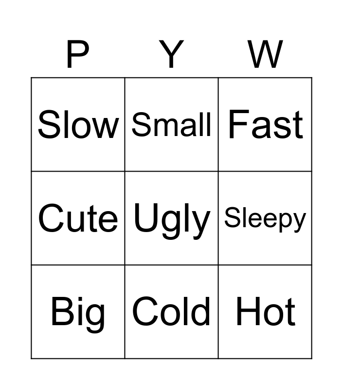 This bingo card has 10 words: Cold, Fast, Slow, Ugly, Cute, Big, Small, Excited, Sleepy and Hot.