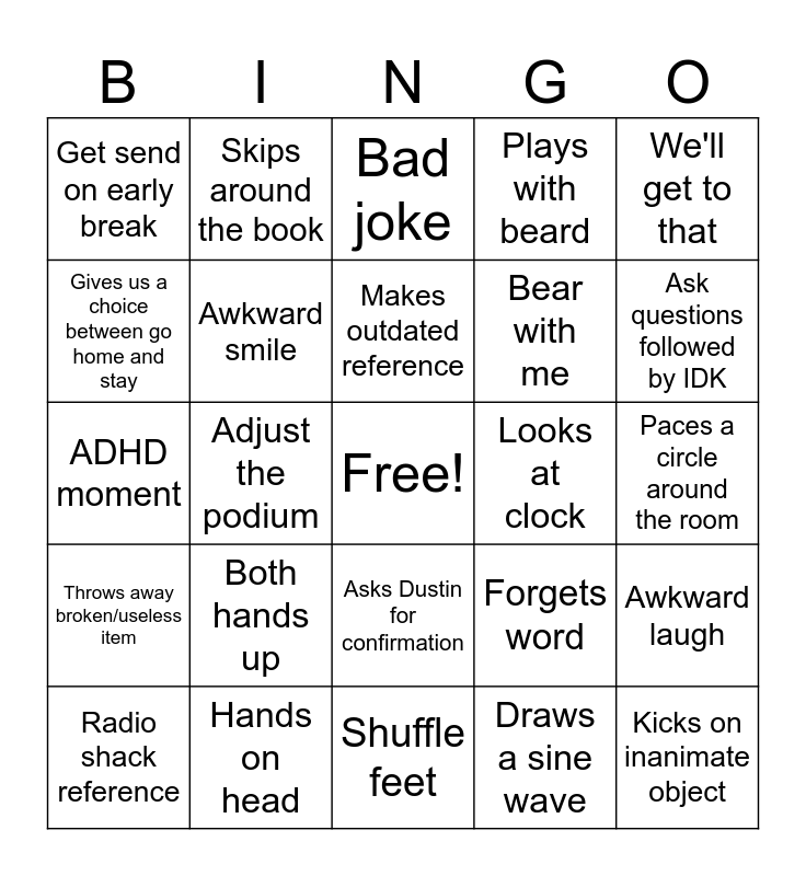 This bingo card has a free space and 24 words: Both hands up, Hands on head, Makes outdated reference, Radio shack reference, We'll get to that, Get send on early break, Gives us a choice between go home and stay, Skips around the book, Looks at clock, Asks Dustin for confirmation, Bear with me, ADHD moment, Forgets word, Awkward laugh, Awkward smile, Draws a sine wave, Paces a circle around the room, Bad joke, Ask questions followed by IDK, Adjust the podium, Kicks on inanimate object, Throws away broken/useless item, Plays with beard and Shuffle feet.