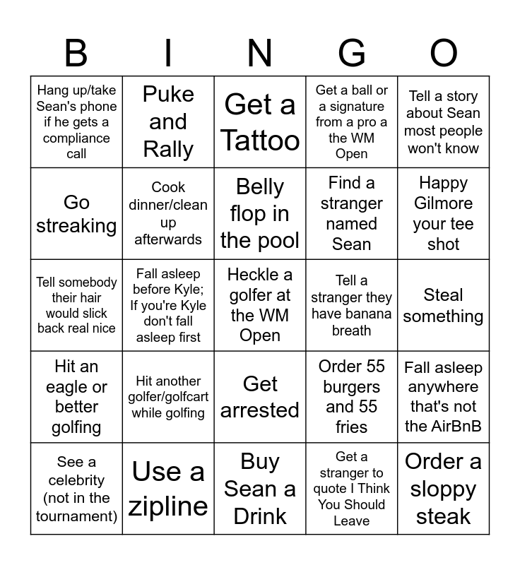 This bingo card has 25 words: Hit an eagle or better golfing, Use a zipline, Heckle a golfer at the WM Open, Get a stranger to quote I Think You Should Leave, Tell a story about Sean most people won't know, Hang up/take Sean's phone if he gets a compliance call, Puke and Rally, Get a Tattoo, Tell a stranger they have banana breath, Fall asleep anywhere that's not the AirBnB, Go streaking, Cook dinner/clean up afterwards, Buy Sean a Drink, Order 55 burgers and 55 fries, Happy Gilmore your tee shot, See a celebrity (not in the tournament), Fall asleep before Kyle; If you're Kyle don't fall asleep first, Belly flop in the pool, Find a stranger named Sean, Steal something, Tell somebody their hair would slick back real nice, Hit another golfer/golfcart while golfing, Get arrested, Get a ball or a signature from a pro a the WM Open and Order a sloppy steak.