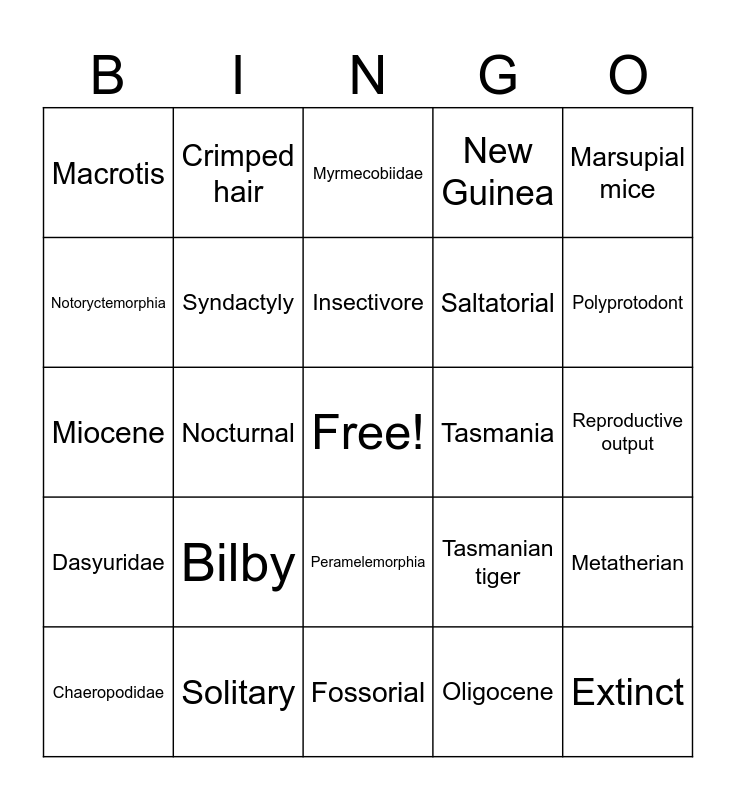 This bingo card has a free space and 43 words: Termite, Extinct, Choriovitelline, Chaeropodidae, Carnivore, Oligocene, Myrmecobiidae, Diprotodont, Marsupial mice, Solitary, New Guinea, Tasmania, Peramelemorphia, Bilby, Backwards pouch, Fossorial, Convergent evolution, Miocene, Dental formula, Polyprotodont, Crimped hair, Omnivorous, Vestigial, Macrotis, Chorioallantoic, Reproductive output, Easter bunny, Bite force, Tasmanian tiger, Dasyuridae, Ancestral form, Metatherian, Phylogenetic tree, Nocturnal, Grasslands, Forests, Weaning, Insectivore, Notoryctemorphia, Saltatorial, Gestation, Syndactyly and Arid habitat.