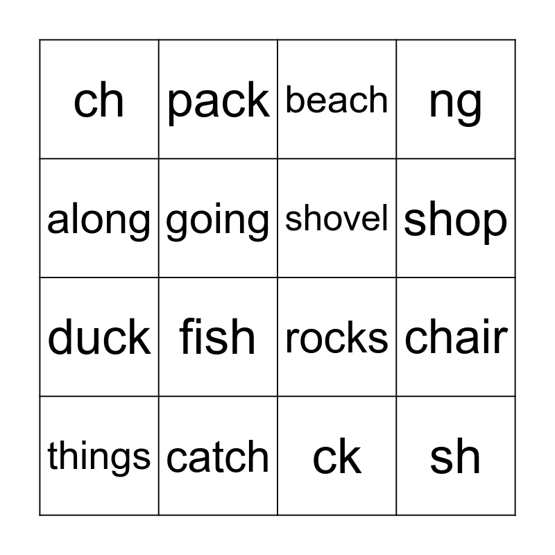 This bingo card has 16 words: catch, chair, beach, ch, duck, pack, rocks, ck, along, going, things, ng, fish, shop, shovel and sh.
