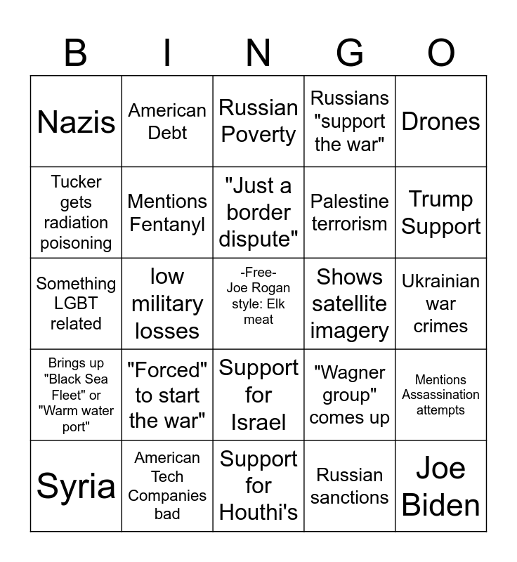 This bingo card has a free space and 24 words: "Forced" to start the war", American Tech Companies bad, "Just a border dispute", Syria, Drones, Nazis, Tucker gets radiation poisoning, American Debt, Shows satellite imagery, Support for Israel, Palestine terrorism, Something LGBT related, "Wagner group" comes up, Mentions Assassination attempts, Mentions Fentanyl, Russian sanctions, Ukrainian war crimes, Russian Poverty, Trump Support, low military losses, Joe Biden, Brings up "Black Sea Fleet" or "Warm water port", Russians "support the war" and Support for Houthi's.