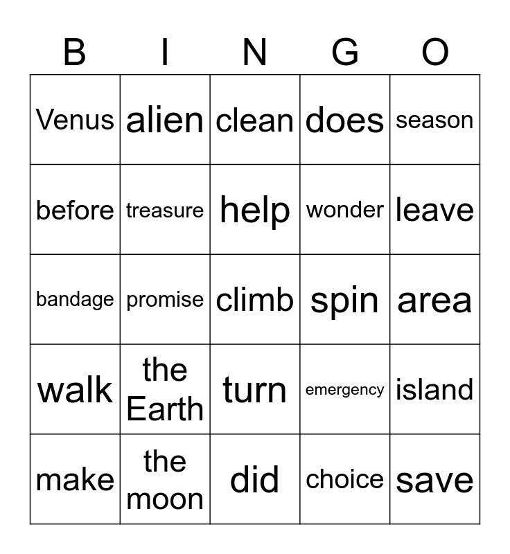 This bingo card has a free space and 24 words: the Earth, the moon, help, make, season, Venus, before, alien, spin, turn, wonder, bandage, emergency, island, treasure, choice, area, clean, leave, promise, save, walk, does and did.