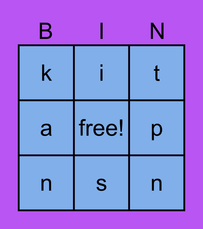 This bingo card has a free space and 8 words: a, i, p, n, t, k, s and n.