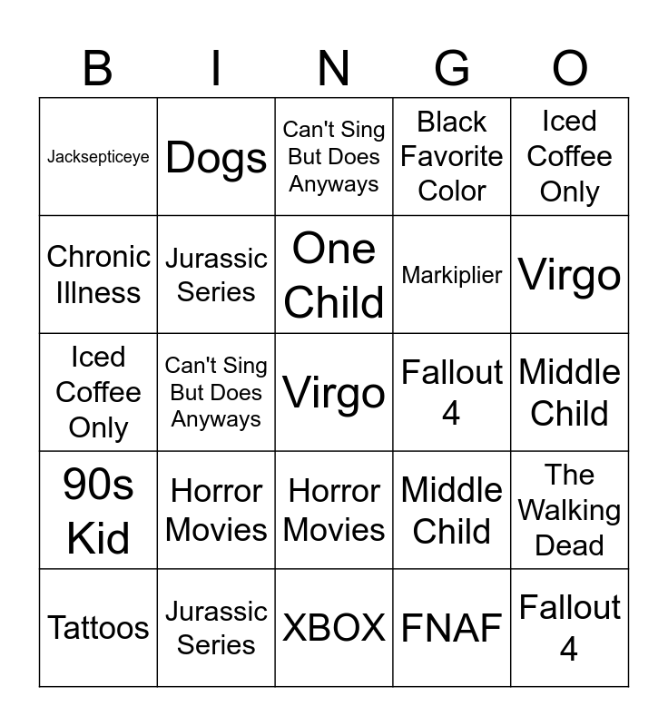 ⚠ This card has duplicate items: Cats (2), Virgo (2), Tattoos (2), XBOX (2), Horror Movies (2), 90s Kid (2), Dogs (2), 🍃 (2), Chronic Illness (2), Harry Potter (2), Jurassic Series (2), Black Favorite Color (2), The Walking Dead (2), Middle Child (2), Natural Redhead (2), Single (2), One Child (2), Fallout 4 (2), Never Been To Disney Parks 😭 (2), Iced Coffee Only (2), Can't Sing But Does Anyways (2), FNAF (2), Jacksepticeye (2), Markiplier (2)