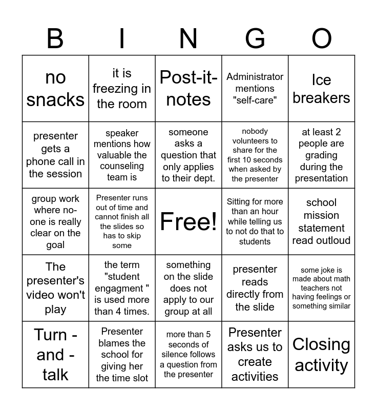 This bingo card has a free space and 24 words: the term "student engagment " is used more than 4 times., Presenter blames the school for giving her the time slot, someone asks a question that only applies to their dept., Turn -and -talk, Ice breakers, no snacks, presenter gets a phone call in the session, it is freezing in the room, Sitting for more than an hour while telling us to not do that to students, something on the slide does not apply to our group at all, nobody volunteers to share for the first 10 seconds when asked by the presenter, group work where no-one is really clear on the goal, presenter reads directly from the slide, some joke is made about math teachers not having feelings or something similar, speaker mentions how valuable the counseling team is, Presenter asks us to create activities, school mission statement read outloud, Post-it-notes, at least 2 people are grading during the presentation, Presenter runs out of time and cannot finish all the slides so has to skip some, Closing activity, The presenter's video won't play, Administrator mentions "self-care" and more than 5 seconds of silence follows a question from the presenter.