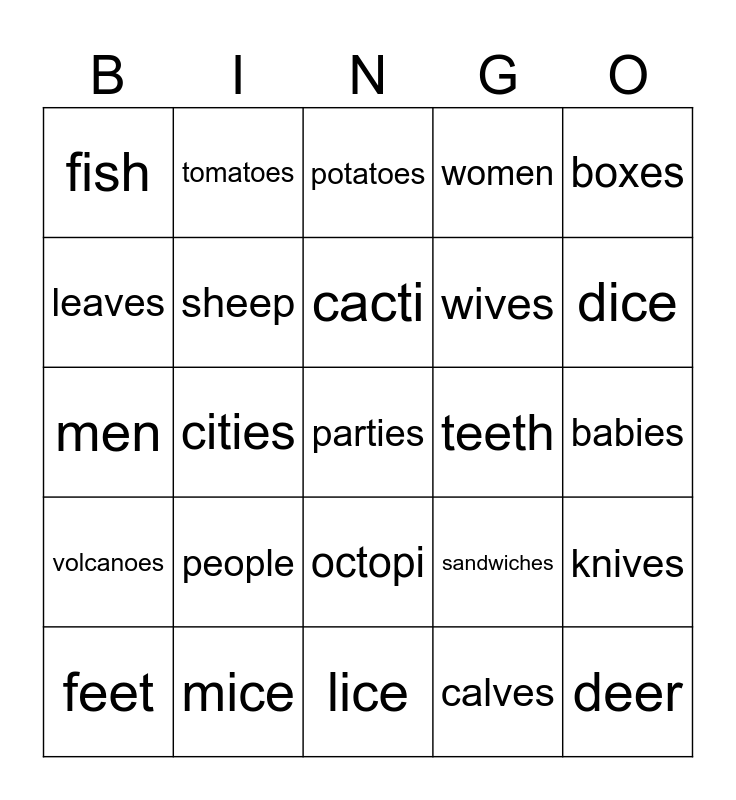 This bingo card has 28 words: knives, lives, wives, calves, leaves, potatoes, tomatoes, volcanoes, teeth, feet, men, women, mice, lice, dice, children, people, sheep, cacti, octopi, fish, deer, parties, cities, babies, sandwiches, boxes and churches.
