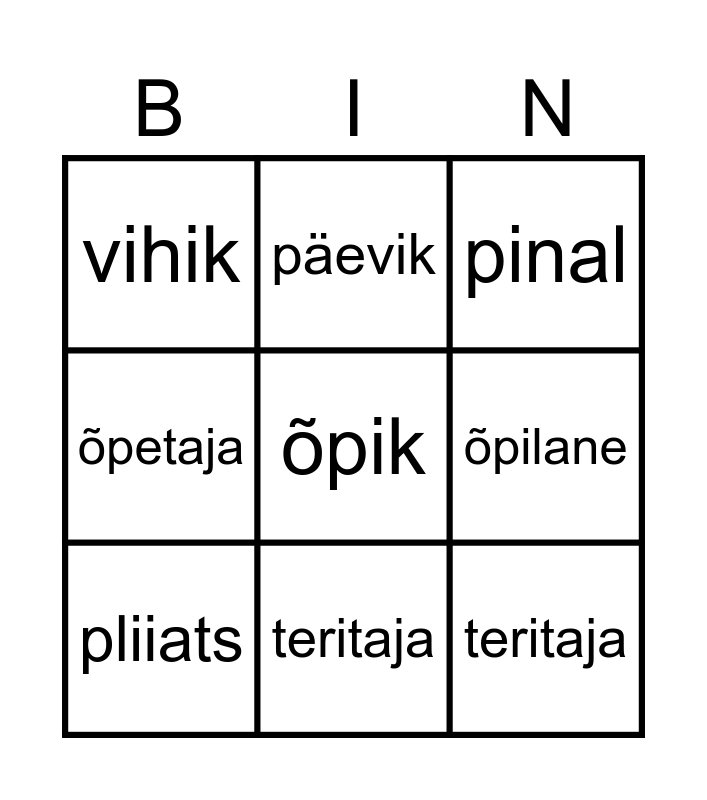 This bingo card has 10 words: teritaja, pinal, vihik, õpik, õpetaja, pliiats, päevik, koolikott, õpilane and teritaja.