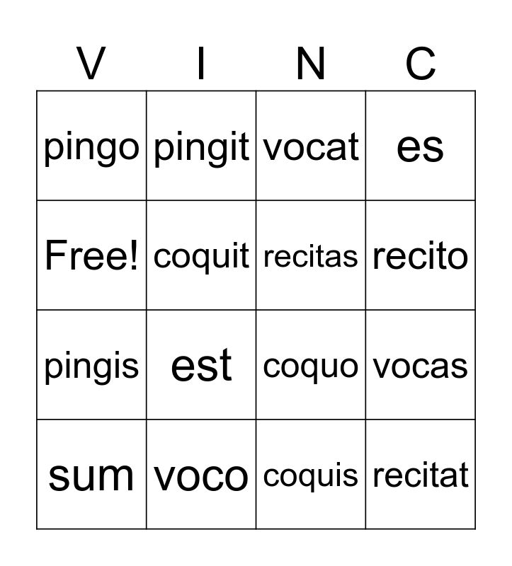 This bingo card has 16 words: voco, vocas, vocat, pingo, pingis, pingit, coquo, coquis, Free!, coquit, sum, es, est, recito, recitas and recitat.