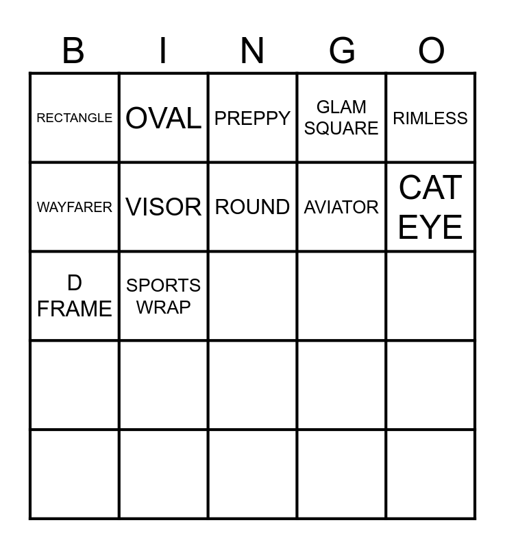 This bingo card has 12 words: CAT EYE, AVIATOR, RIMLESS, WAYFARER, OVAL, PREPPY, ROUND, SPORTS WRAP, RECTANGLE, GLAM SQUARE, VISOR and D FRAME.