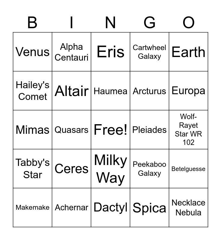 This bingo card has a free space and 24 words: Ceres, Achernar, Haumea, Makemake, Earth, Venus, Hailey's Comet, Alpha Centauri, Pleiades, Milky Way, Arcturus, Mimas, Peekaboo Galaxy, Betelguesse, Altair, Spica, Wolf-Rayet Star WR 102, Eris, Europa, Quasars, Necklace Nebula, Tabby's Star, Cartwheel Galaxy and Dactyl.