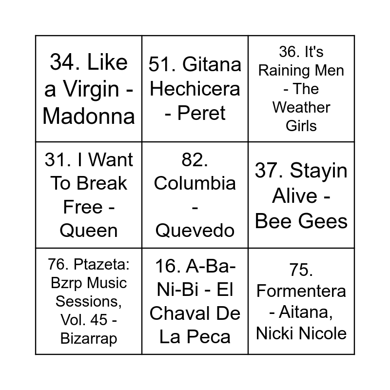 This bingo card has 89 words: 1. La Revolución Sexual - La Casa Azul, 2. Yo Quiero Bailar - Sonia Y Selena, 3. Cuando zarpa el amor - Camela, 4. Tu Calorro - Estopa, 5. Con la luna llena - Melendi, 6. Búscate un hombre que te quiera - El Arrebato, 7. Caminando por la vida - Melendi, 8. Princesas - Pereza, 9. Milionària - ROSALÍA, 10. La chica yeye - Ole Ole, 11. A quien le importa - Fangoria, 12. Solo Se Vive una Vez - Azucar Moreno, 13. Amigos para Siempre - Los Manolos, 14. Eva Maria - Formula V, 15. La Barbacoa - Georgie Dann, 16. A-Ba-Ni-Bi - El Chaval De La Peca, 17. Maquillaje - Mecano, 18. Amante Bandido - Miguel Bose, 19. Color Esperanza - Diego Torres, 20. Ya No Quiero Nah - Lola Indigo, 21. Que la Detengan - David Civera, 22. Antes Muerta Que Sencilla – Maria Isabel, 23. Buleria - David Bisbal, 24. Dime - Beth, 25. Sobrevivire - Monica Naranjo, 26. Caipirinha - Carlinhos Brown, 27. Sarandonga - Lolita, 28. Resistire - Duo Dinamico, 29. Billie Jean - Michael Jackson, 30. Girls Just Want to Have Fun - Cyndi Lauper, 31. I Want To Break Free - Queen, 32. The Best - Tina Turner, 33. Maniac - Michael Sembello, 34. Like a Virgin - Madonna, 35. Y.M.C.A. - Village People, 36. It's Raining Men - The Weather Girls, 37. Stayin Alive - Bee Gees, 38. Wake Me Up Before You Go-Go - Wham!, 39. Never Gonna Give You Up - Rick Astley, 40. The Final Countdown - Europe, 41. Eye of the Tiger - Survivor, 42. Satisfaction - The Rolling Stones, 43. Let's Twist Again - Chubby Checker, 44. Oh, Pretty Woman - Roy Orbison, 45. La Moto - Arrels De Gràcia, 47. Samarreta - Gertrudis, 48. Gitanitos y Morenos - Los Chichos, 49. Quina Calor! - Arrels De Gràcia, 50. Ingobernable - C. Tangana, 51. Gitana Hechicera - Peret, 52. Corazón Partío - Alejandro Sanz, 53. Pepas - Farruko, 54. Todo De Ti - Rauw Alejandro, 55. La niña de la Escuela - Lola Indigo, TINI, Belinda, 56. KESI - Camilo, 57. Tú Me Dejaste De Querer - C. Tangana, 58. La Gozadera - Gente De Zona, Marc Anthony, 59. Ritmo de la Noche - Mystic, 60. Verano Azul - Juan Magán, 61. Mayonesa - Chocolate, 62. Ni Una Sola Palabra - Paulina Rubio, 63. Clavado en Un Bar - Maná, 64. Levantando las Manos - Dos Morenos, 65. Tusa - KAROL G, Nicki Minaj, 66. Despacito - Luis Fonsi, Daddy Yankee, 67. Una Vaina Loca - Fuego, 68. Soldadito marinero - Fito y Fitipaldis, 69. Viva La Vida - Coldplay, 70. Cannabis - Ska-P, 71. Himne F.C. Barcelona - Coral Sant Jordi, 72. Els Segadors - Coral Sant Jordi, 73. Petar-ho - Oques Grasses, 74. Estiu - ZOO, 75. Formentera - Aitana, Nicki Nicole, 76. Ptazeta: Bzrp Music Sessions, Vol. 45 - Bizarrap, 77. Lo Malo - Aitana, Ana Guerra, 78. Flowers - Miley Cyrus, 79. PETONS - Stay Homas, 80. Coti x Coti - The Tyets, 81. Voy a Celebrarlo - Lágrimas De Sangre, 82. Columbia - Quevedo, 83. Pobre Diabla - Don Omar, 84. Gasolina - Daddy Yankee, 85. Zorra - Bad Gyal, 86. UNA NOCHE EN MEDELLIN - KAROL G, 87. Supermercat - Lildami, 88. Dale Don Dale - Don Omar, 89. Con Tol Deskaro - Tremenda Jauría and 90. Mujeres - Tribade.