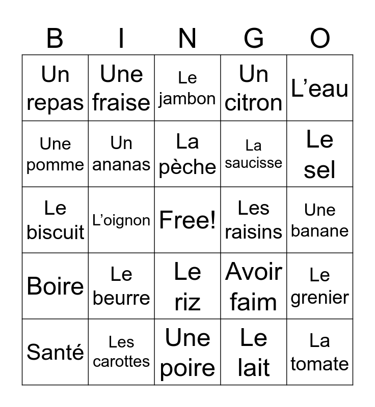 This bingo card has a free space and 73 words: Le bacon, Le toast, Un repas, Le déjeuner, Le petit-déjeuner, Manger, Boire, Un goûter, Avoir faim, J’ai faim, Avoir soif, J’ai soif, Un ananas, Une banane, Une cerise, Une fraise, Une poire, Une pomme, Une pamplemousse, Les raisins, La pèche, Un citron, L’eau, Une boisson, Santé, La bière, Le café, Le thé, Le jus, L’aubergine, Les carottes, Les épinards, Le brocoli, Les haricots, L’oignon, Le concombre, La pomme de terre, Les fruits de mer, La tomate, L’avocat, Le lait, Le beurre, La viande, Le boeuf, Le poulet, La saucisse, Le jambon, Le poisson, Les escargots, Le biscuit, Le gâteau, Les bonbons, Le chocolat, La tarte, Un beignet, Un oeuf, Le pain, Le riz, Le gruau, La soupe, La confiture, La moutarde, Le miel, Le sel, Le poivre, Le couloir, La salle de bain, La chambre, Le grenier, Parce que, Avec, Sans and Mais.