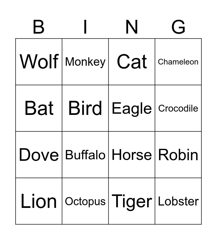 This bingo card has 20 words: Robin, Yak, Cat, Rabbit, Lion, Bat, Octopus, Wolf, Dove, Monkey, Buffalo, Horse, Bird, Lobster, Eagle, Walrus, Crocodile, Chameleon, Tiger and Dog.