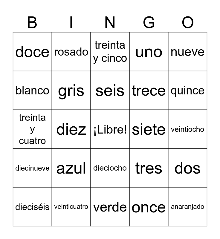 This bingo card has a free space and 49 words: rojo, anaranjado, amarillo, verde, azul, morado, rosado, café, blanco, negro, gris, uno, dos, tres, cuatro, cinco, seis, siete, ocho, nueve, diez, once, doce, trece, catorce, quince, dieciséis, diecisiete, dieciocho, diecinueve, veinte, veintiuno, veintidós, veintitrés, veinticuatro, veinticinco, veintiséis, veintisiete, veintiocho, veintinueve, treinta, treinta y uno, treinta y dos, treinta y tres, treinta y cuatro, treinta y cinco, treinta y seis, treinta y siete and treinta y ocho.